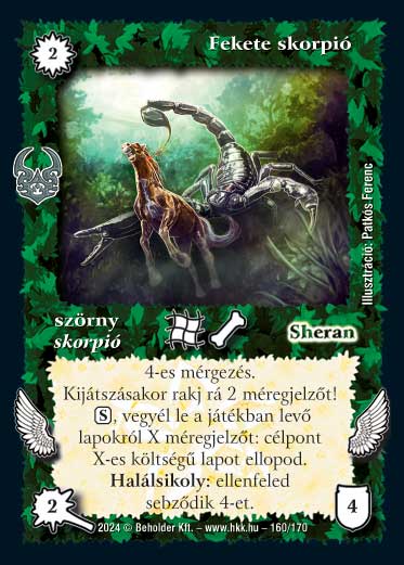 Kiadás: Ősi Káosz Gyakoriság: nem gyakori Lapszín (isten): Sheran Típus: szörny Altípus: skorpió Szöveg: 4-es mérgezés. Kijátszásakor rakj rá 2 méregjelzőt! (S), vegyél le a játékban levő lapokról X méregjelzőt: célpont X-es költségű lapot ellopod Halálsikoly: ellenfeled sebződik 4-et. Illusztráció: Patkós Ferenc