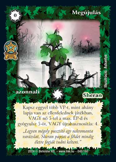 Kiadás: Varázsdimenzió Gyakoriság: ritka Lapszín (isten): Sheran Típus: azonnali Szöveg: Kapsz eggyel több VP-t, mint ahány lapja van az ellenfelednek játékban, VAGY nő 5-tel a max. ÉP-d és gyógyulsz 5-öt VAGY újrahasznosítás: 4. Szinesítő szöveg: "Legyen mégoly pusztító egy nekromanta varázslat, Sheran papjai a földet mindig életre fogják tudni kelteni." Illusztráció: Ashantye