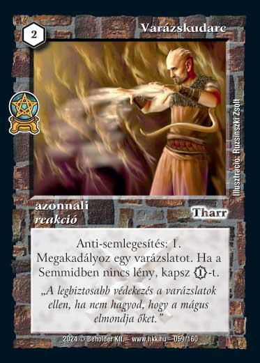 Kiadás: Varázsdimenzió Gyakoriság: ritka Lapszín (isten): Tharr Típus: azonnali Altípus: reakció Szöveg: Anti-semlegesítés: 1. Megakadályoz egy varázslatot. Ha a Semmidben nincs lény, kapsz 1_VP-t. Szinesítő szöveg: "A legbiztosabb védekezés a varázslatok ellen, ha nem hagyod, hogy a mágus elmondja őket." Illusztráció: Ruzsinszki Zsolt